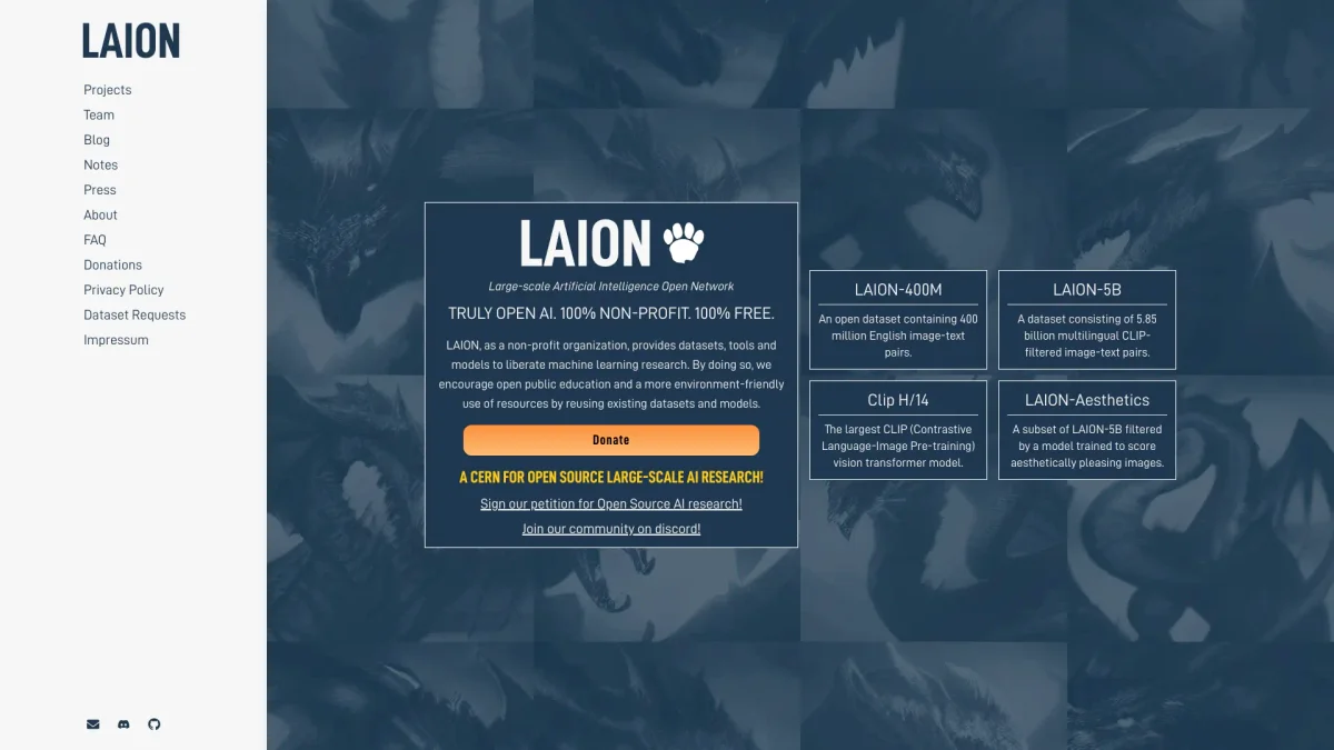 LAION is a non-profit organization that provides free datasets and tools to support machine learning research and promote environmental sustainability in AI.