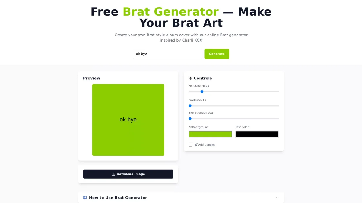 BratifyOnline lets you design unique Brat-style album covers effortlessly, inspired by Charli XCX, with customizable colors and instant downloads.