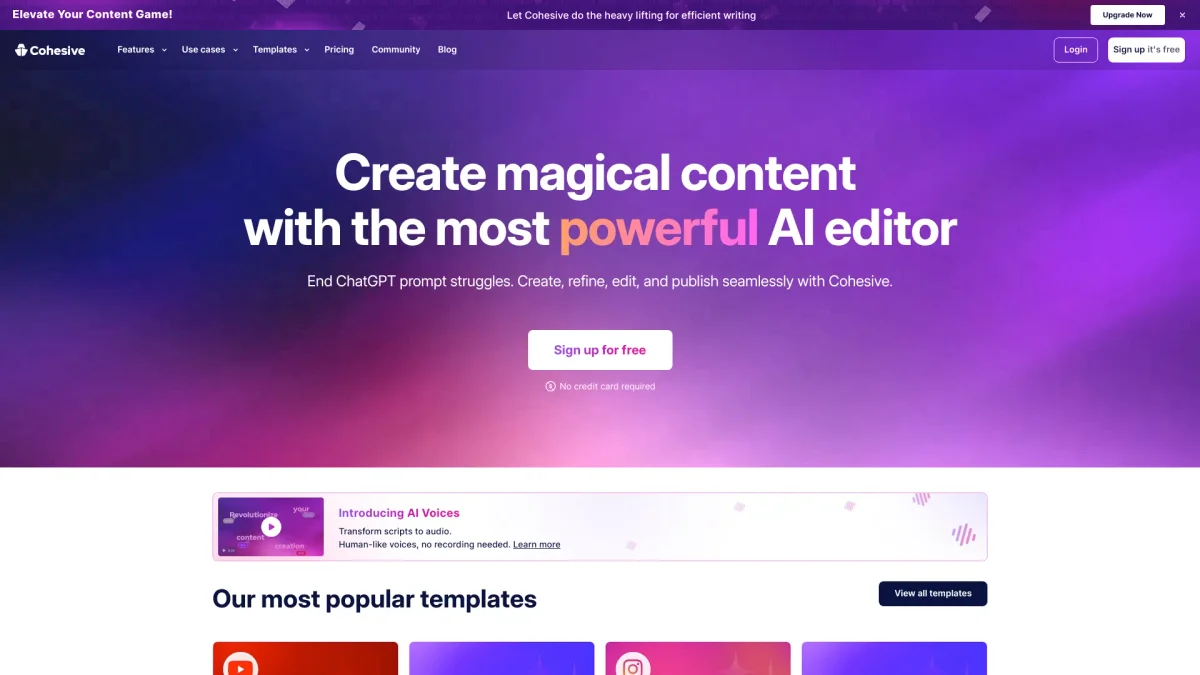 Cohesive is a powerful AI writing tool that helps you create, refine, and publish engaging content quickly and efficiently, tailored for diverse needs.