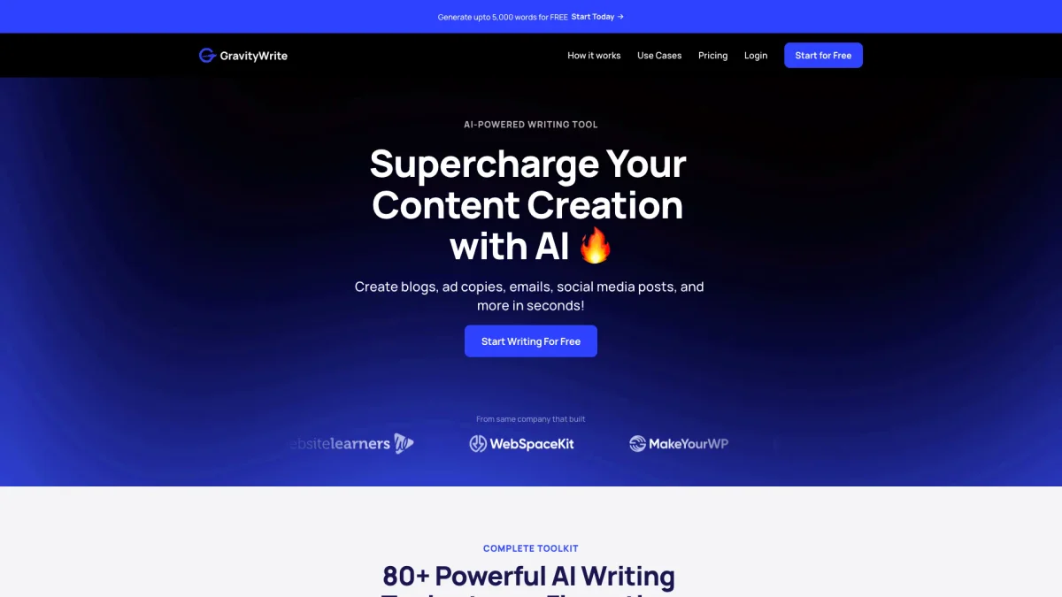 GravityWrite empowers users to generate SEO-friendly blogs, captivating social media posts, and stunning visuals swiftly and efficiently using advanced AI technology.