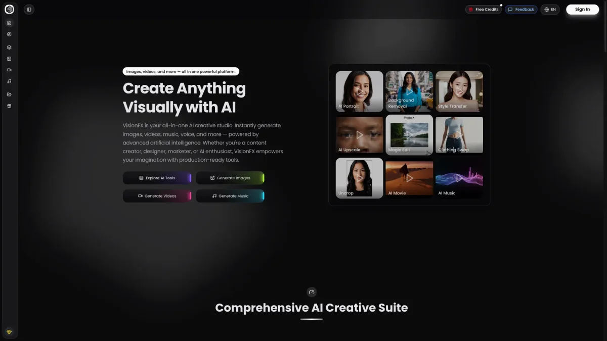 VisionFX offers an all-in-one creative studio to generate stunning images, videos, music, and more using advanced artificial intelligence, empowering creators of all types.
