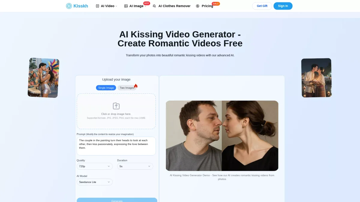 Transform your photos into beautiful romantic kissing videos effortlessly with KisskhArt's advanced AI technology, perfect for couples and content creators alike.