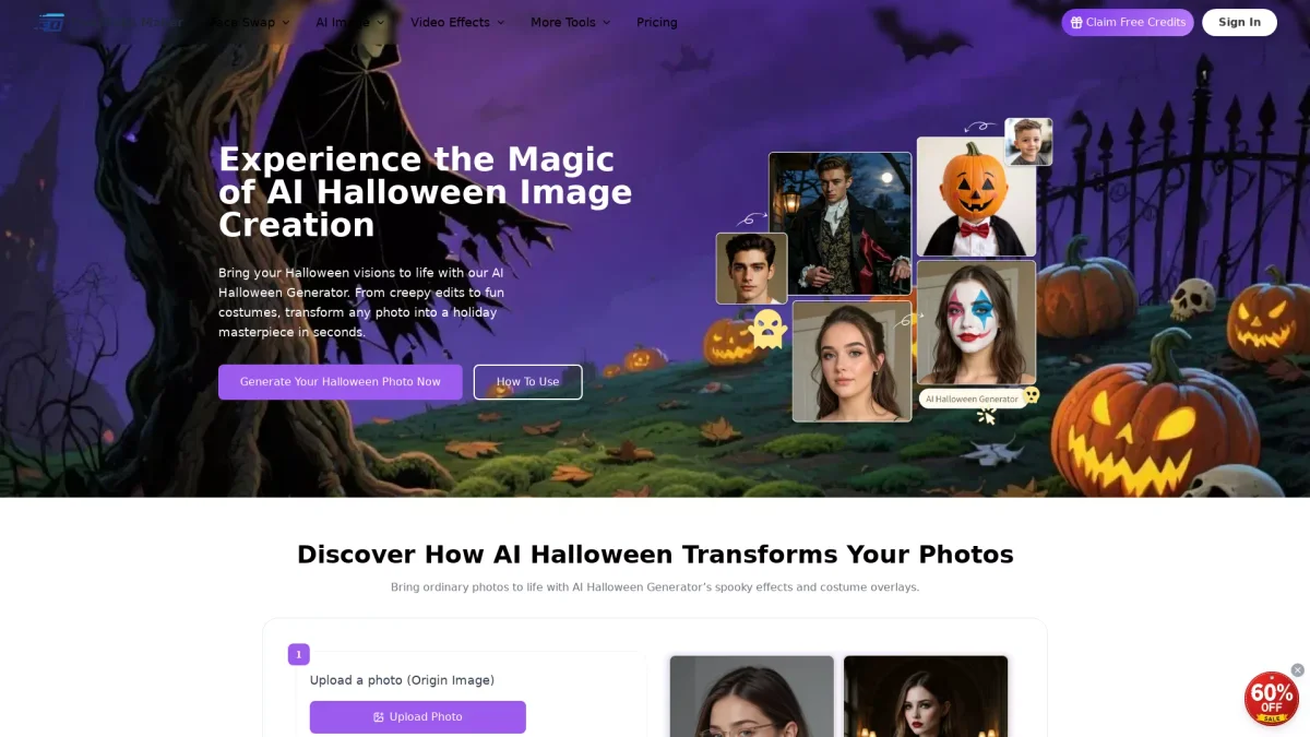 Transform your photos into Halloween masterpieces with our AI-powered generator, featuring spooky effects and costume overlays for fun and festive creations.