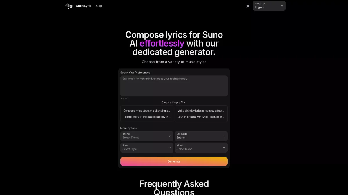 Snon Lyric is an advanced AI lyric generator, enabling users to compose unique lyrics across various genres and themes in seconds, transforming creative ideas into song lyrics effortlessly.