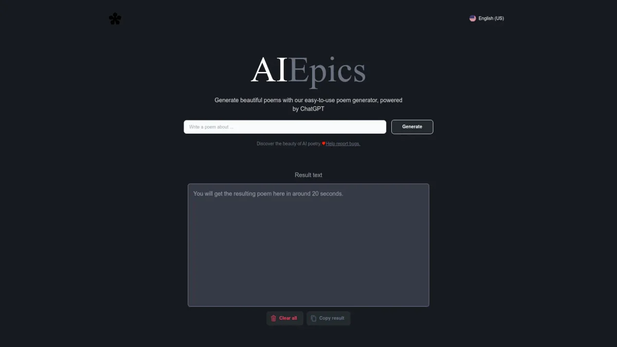 AIePics is a free online AI poem generator that creates beautiful, original poems tailored to your prompts, using advanced AI technology.