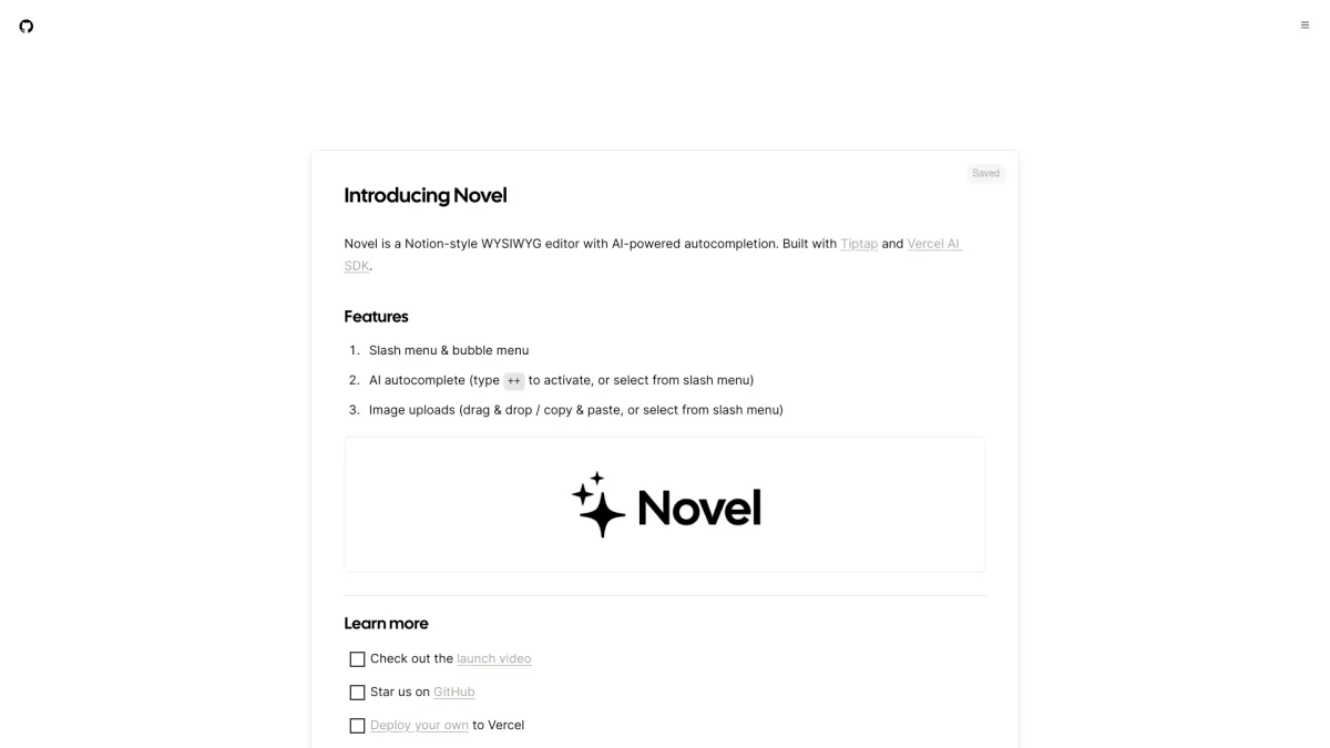 NovelSH is a Notion-style WYSIWYG editor that simplifies content creation with AI-powered autocompletions, enhancing productivity for writers and content creators.
