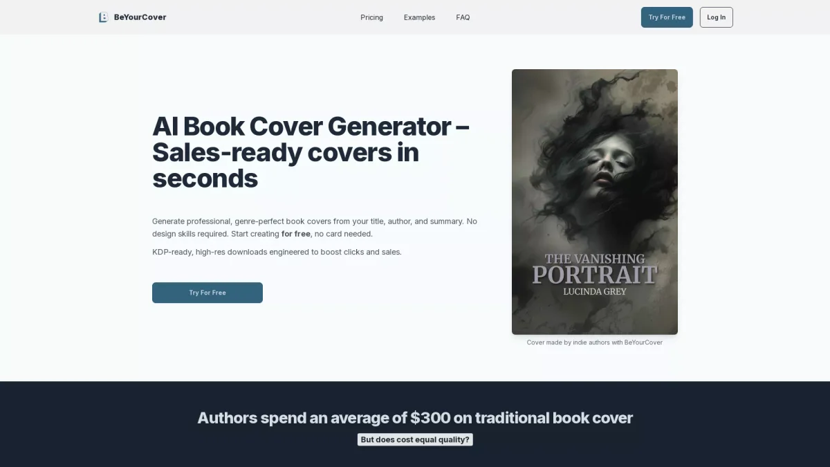 Transform your book's appeal with BeYourCover's AI-generated, genre-perfect covers, crafted effortlessly in seconds—no design skills required.