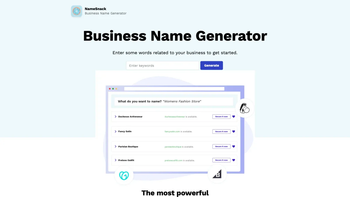 NameSnack is a powerful business name generator that helps you create unique brand names for free using machine learning and keyword techniques.