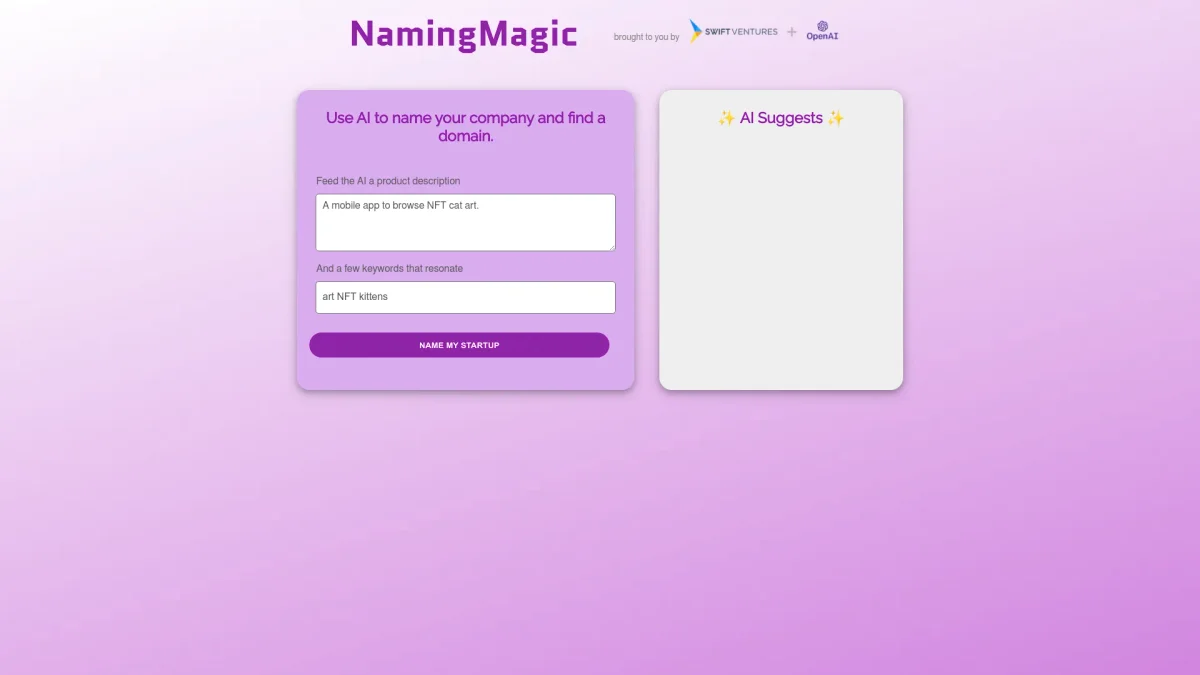 Discover unique company names and available domains effortlessly with Namingmagic's AI-powered suggestions tailored to your business idea and keywords.