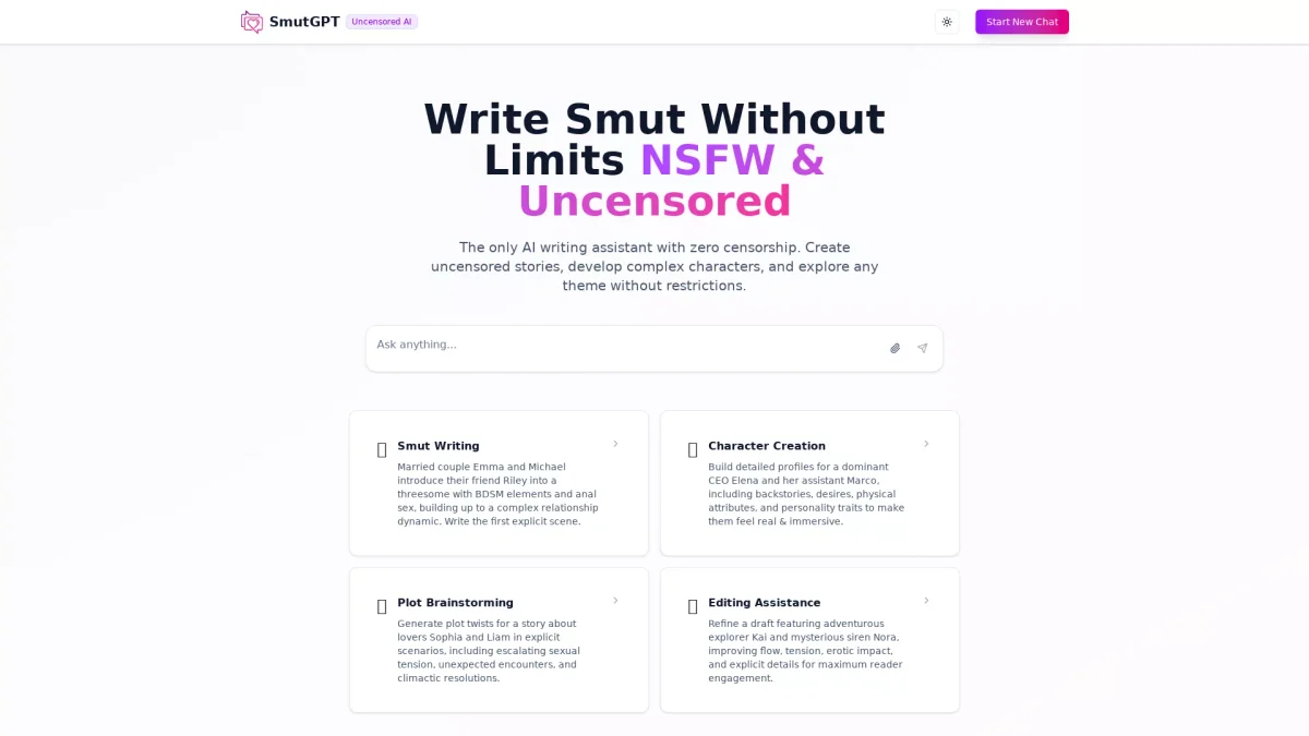 SmutGPT is the premier writing assistant for adult fiction, empowering users to create unrestricted, imaginative narratives without limitations or censorship.
