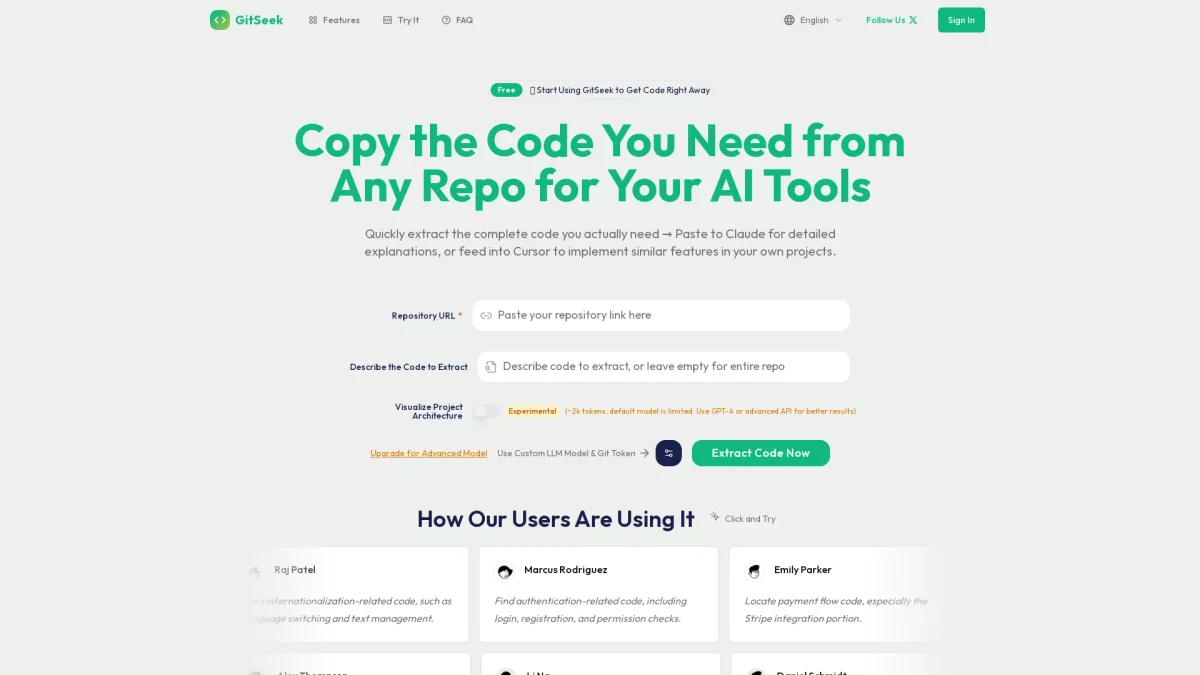 GitSeek allows users to quickly extract and visualize complete code from any repository, streamlining the integration of AI tools into projects.