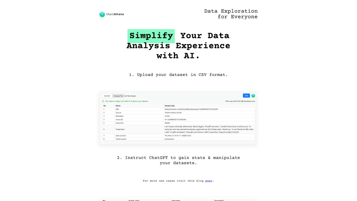Chat2Stats simplifies data analysis by turning complex statistics into understandable insights, making data accessible for everyone, regardless of technical background.
