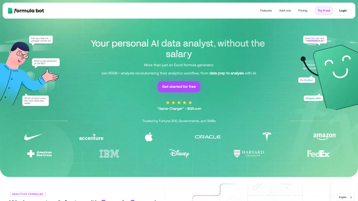 Formula Bot empowers users to quickly derive insights from data, transforming complex datasets into clear visuals and actionable reports without requiring technical expertise.