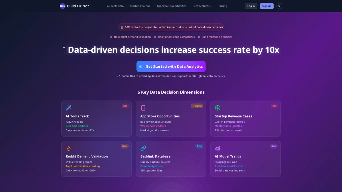 Build Or Not empowers entrepreneurs with data analytics to validate ideas, analyze markets, and make informed investment decisions for startup growth.