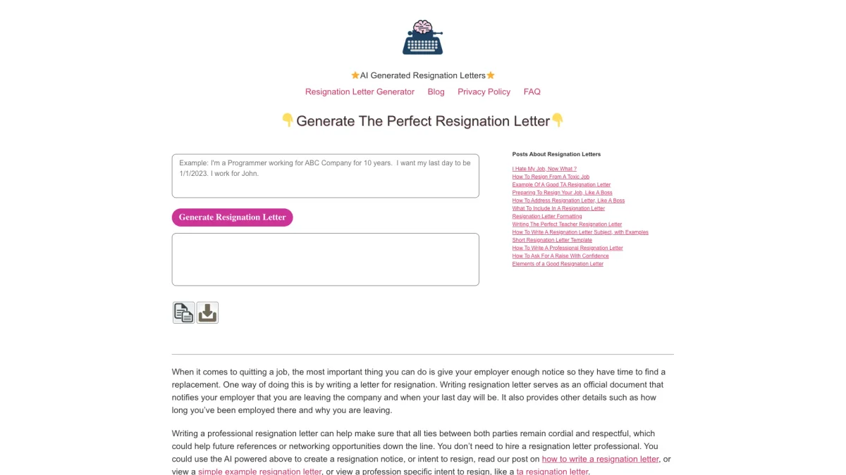 Generate a professional resignation letter in just 30 seconds with our AI-driven tool, ensuring a respectful and clear departure from your job.