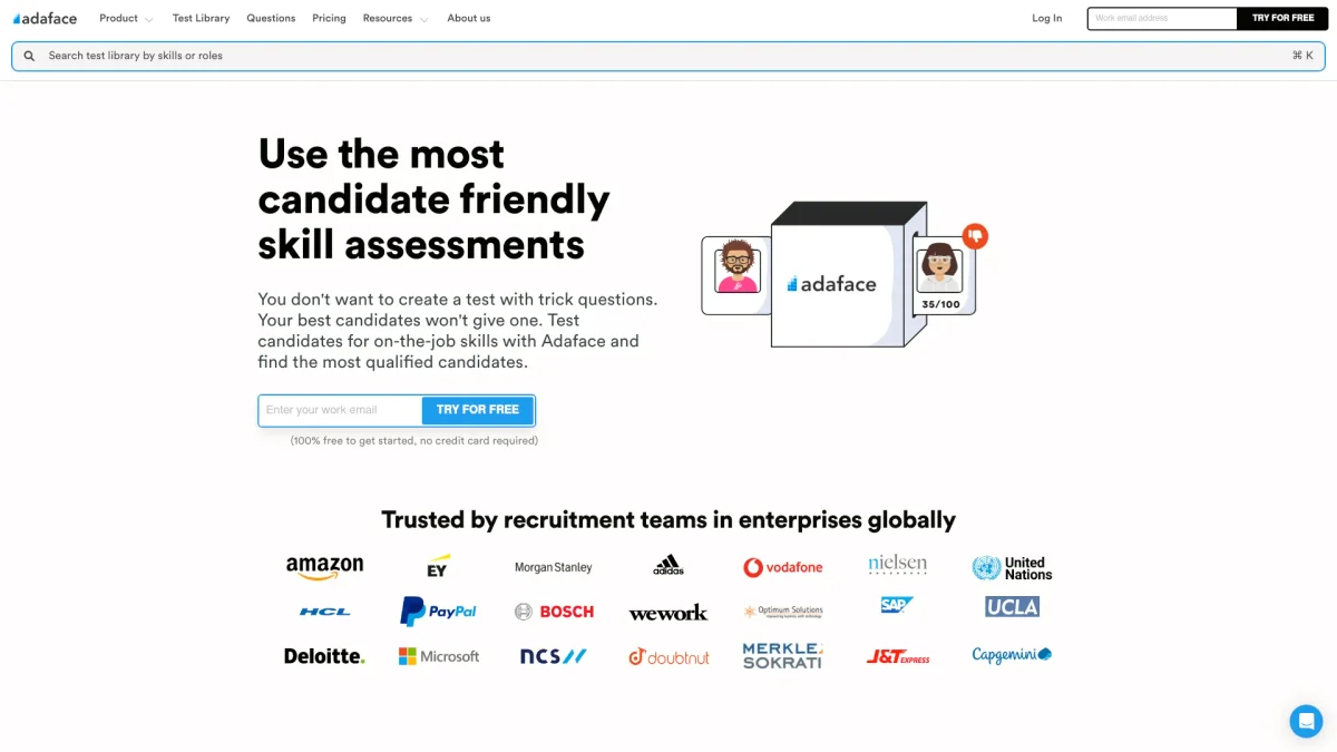 Adaface offers 40-minute skills tests across 500+ roles, focusing on practical skills without trick questions to enhance candidate selection.