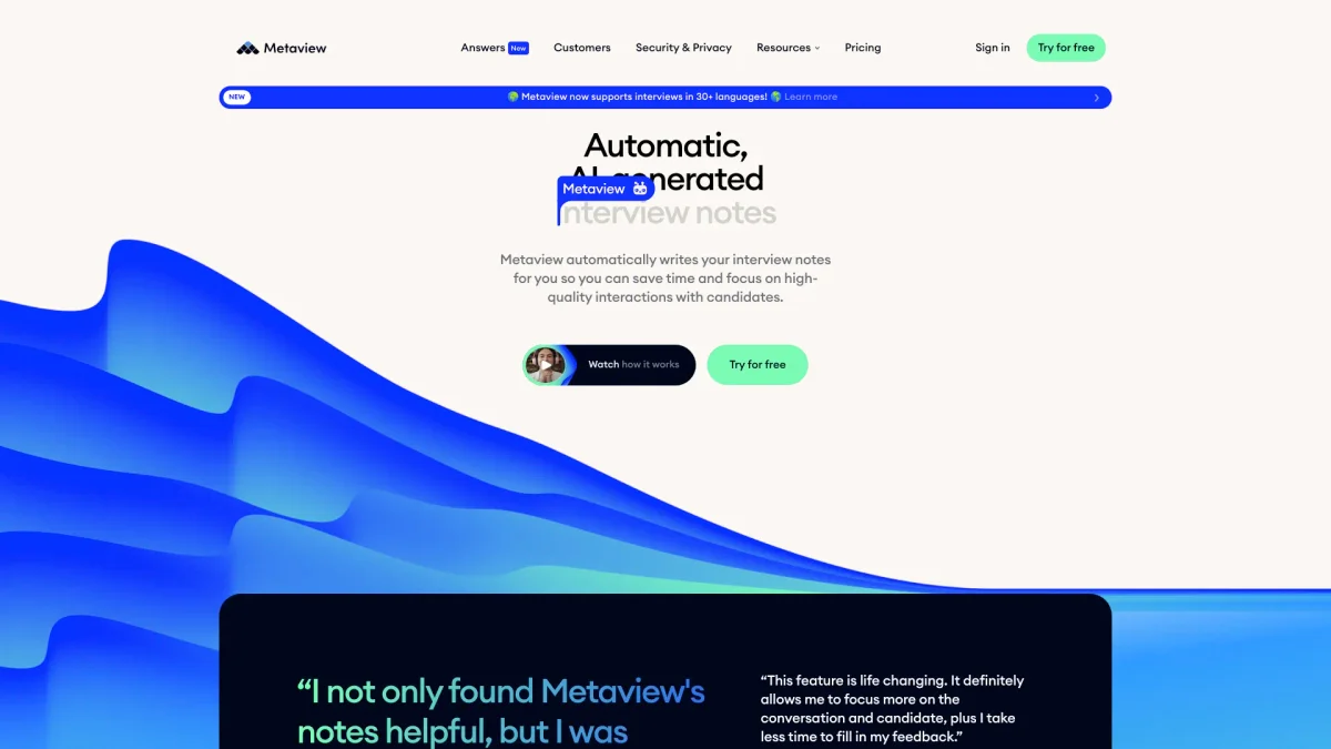 MetaviewAI is an AI-powered recruiting platform that enhances hiring efficiency through advanced notetaking, candidate sourcing, and actionable insights for recruiters and hiring teams.
