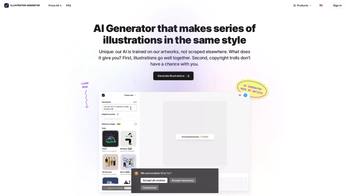 The AI Illustration Generator allows users to create unique, consistent illustrations and icons quickly, making it ideal for designers, marketers, and content creators alike.