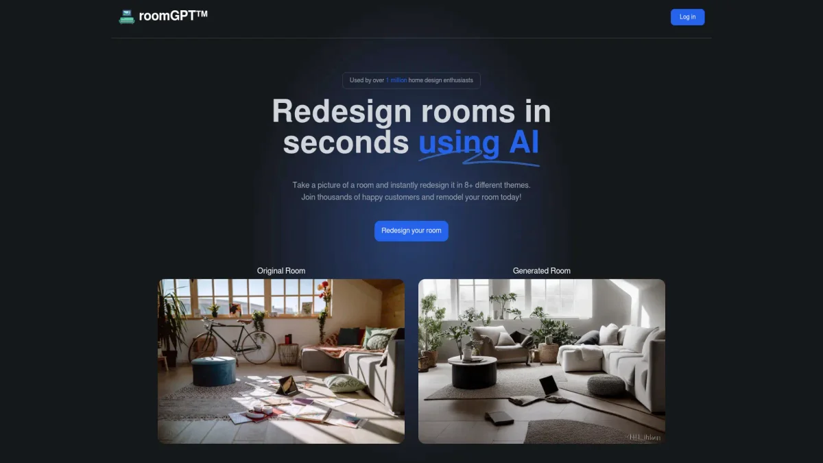 Transform your living space effortlessly with RoomGPT, the AI interior designer trusted by over 2 million users worldwide to create stunning room designs.