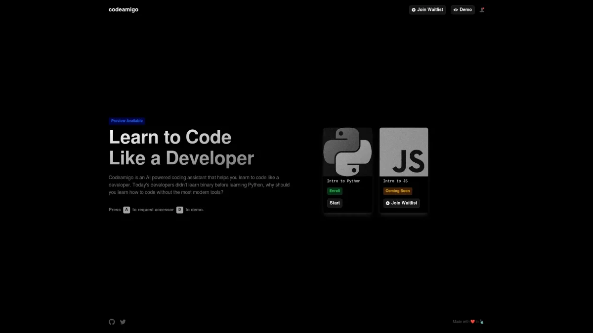 Codeamigo is an AI-powered coding assistant designed to help users learn programming efficiently and effectively using modern tools and techniques.