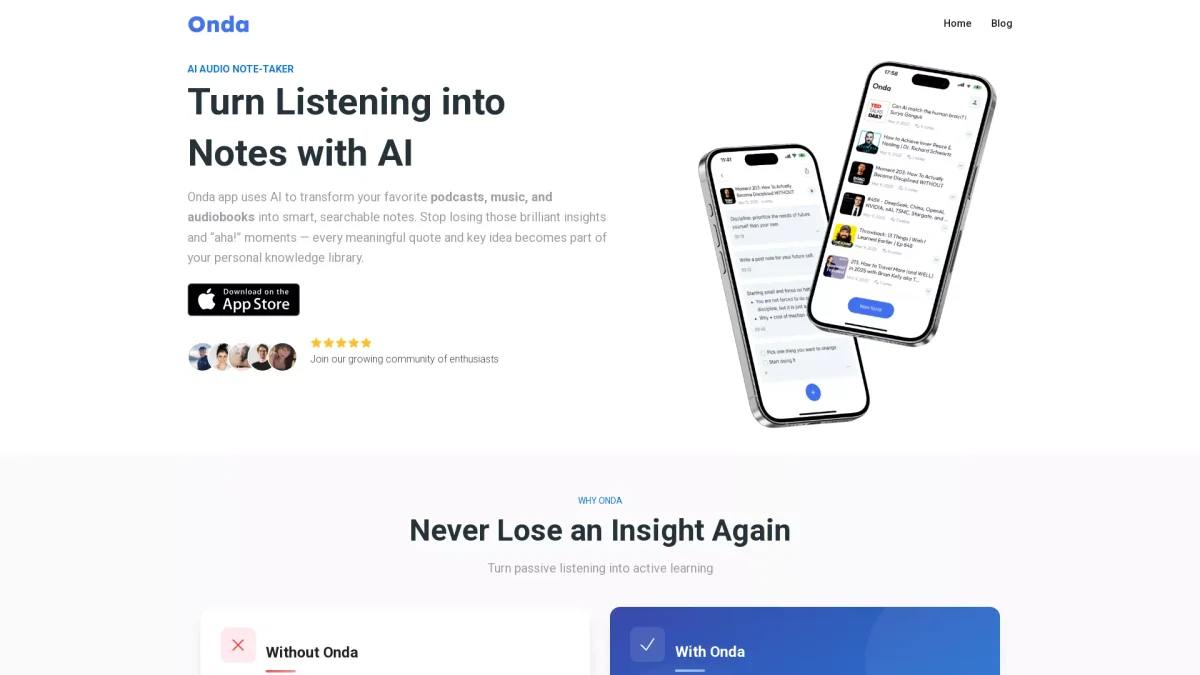 Onda turns passive podcast listening into active learning by capturing insightful notes, quotes, and summaries for easy reference and application.