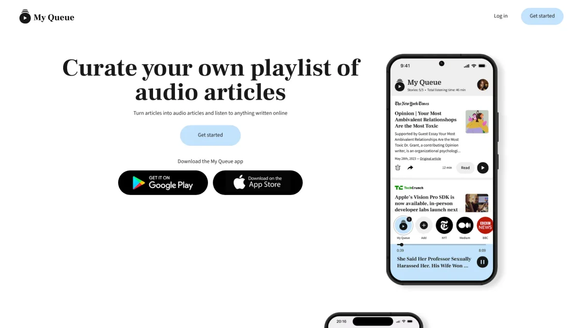 MyQueue allows users to listen to articles from major news platforms, reducing screen time while staying informed on the go.