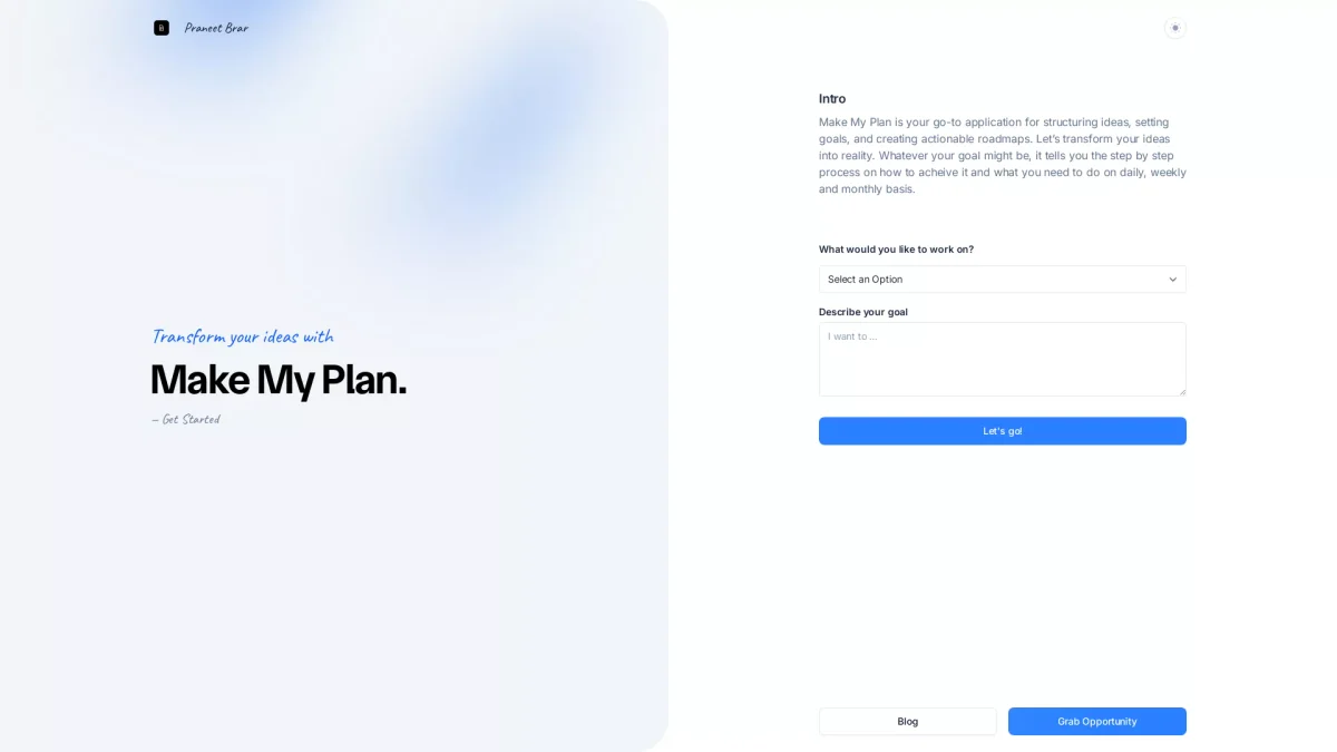 Make My Plan helps you structure ideas, set goals, and create actionable roadmaps for achieving your objectives step by step.