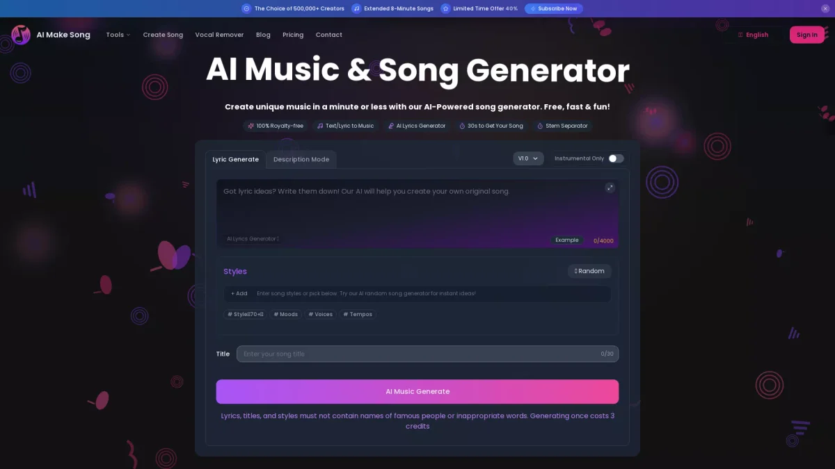Ai Music Generator turns your lyrics into studio-quality songs with vocals and instruments in just 30 seconds, making music creation accessible and fun.