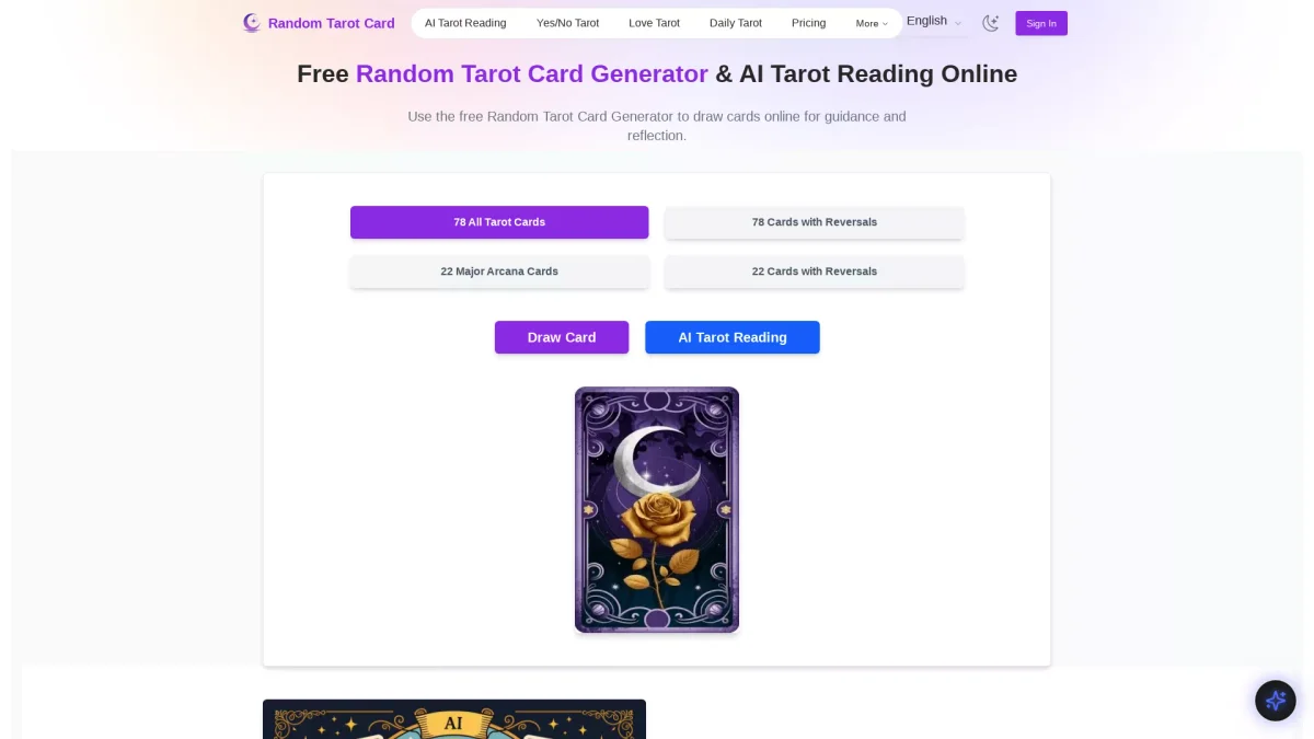 Explore insights and guidance with the Random Tarot Card Generator, offering personalized tarot readings and interpretations for love, daily insights, and more.