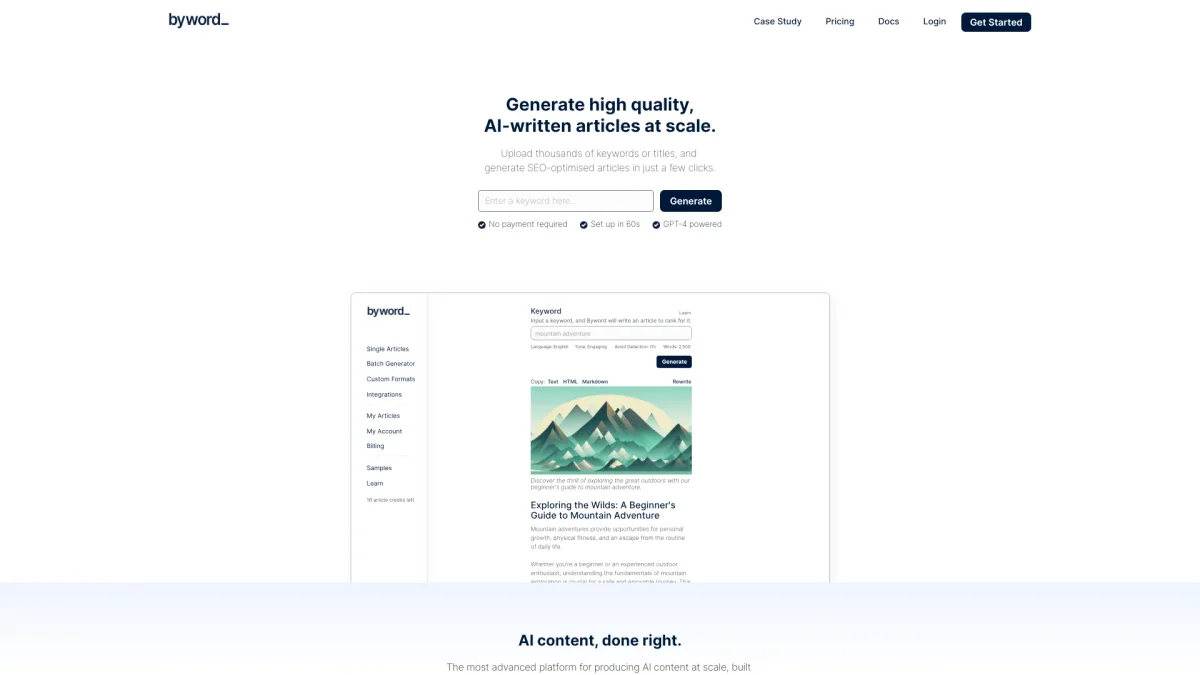 BywordAI generates high-quality, SEO-optimized articles quickly, leveraging advanced AI to enhance your content marketing strategy effortlessly.