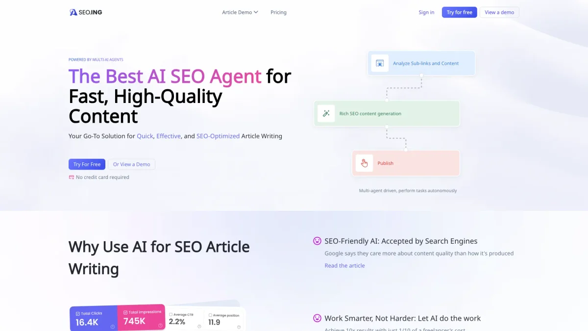 Create high-quality, SEO-optimized content quickly and affordably with seo.ing, your ultimate AI writing assistant for effective digital marketing.