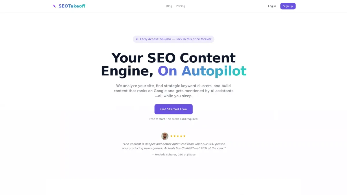 SEOTakeoff offers comprehensive SEO solutions including site audits, keyword strategies, and content generation, all for a fraction of traditional agency costs.