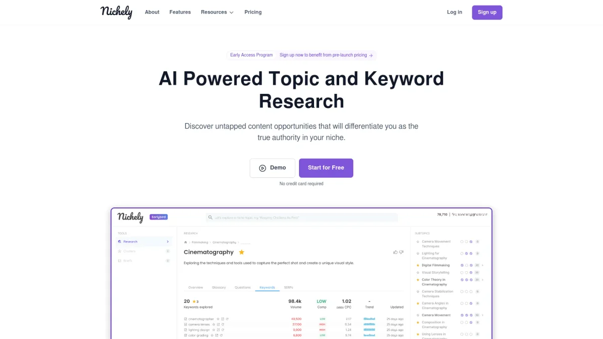 NichelyAI empowers users to uncover unique content opportunities and build topical authority through advanced topic and keyword research tools tailored for any niche.
