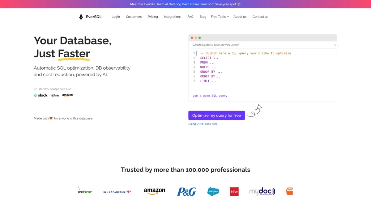 EverSQL automates SQL query optimization for PostgreSQL and MySQL, enhancing performance and reducing database costs effortlessly and securely.