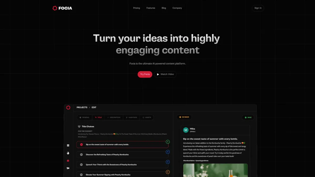 Focia helps content creators analyze and predict engagement metrics, allowing them to optimize their ideas for maximum audience impact across various platforms.