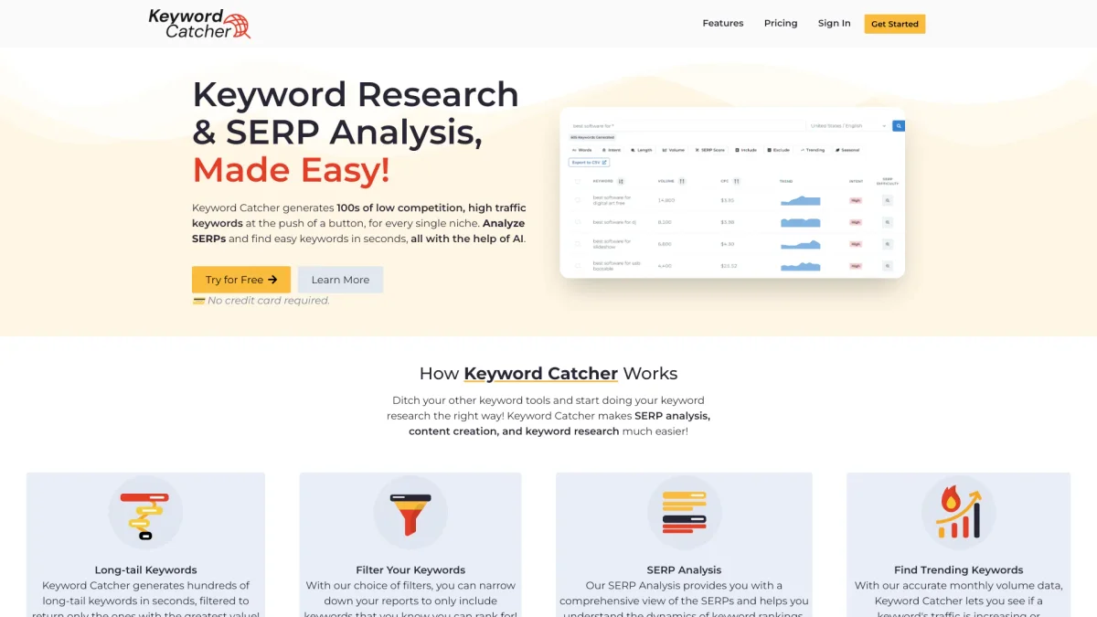 Keyword Catcher simplifies SERP analysis and keyword research, providing users with actionable insights to enhance their content strategy and SEO performance.