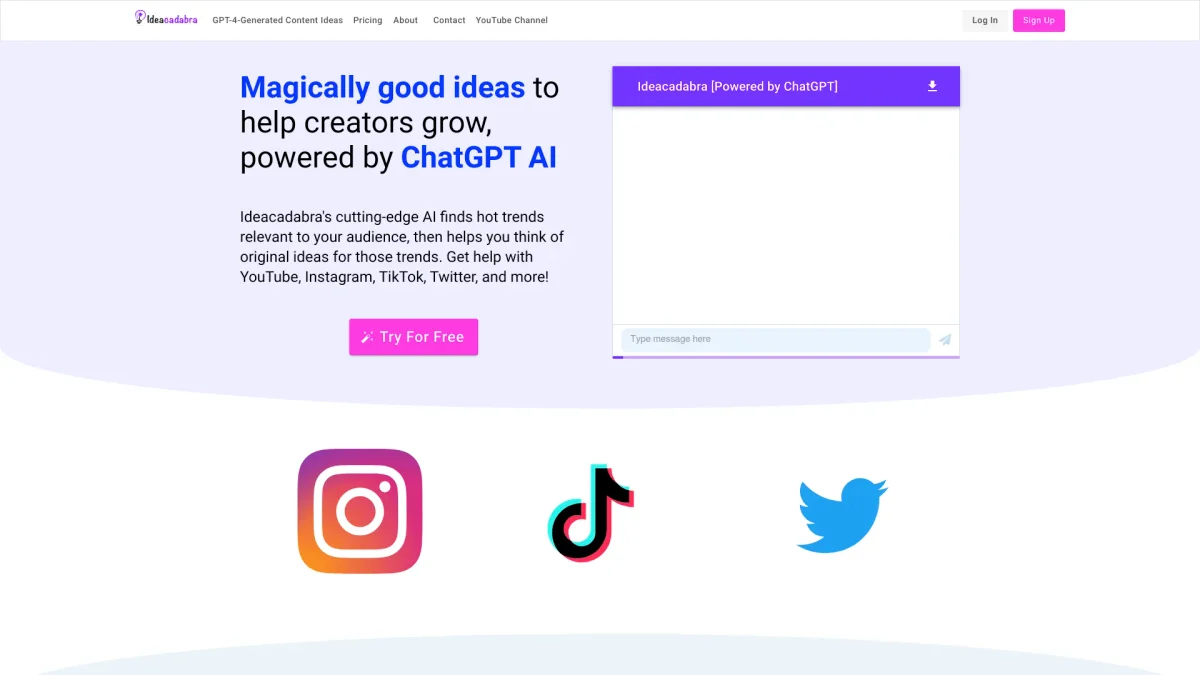 Ideacadabra generates personalized content ideas for social media creators, streamlining the creative process across platforms like YouTube, Instagram, and TikTok.